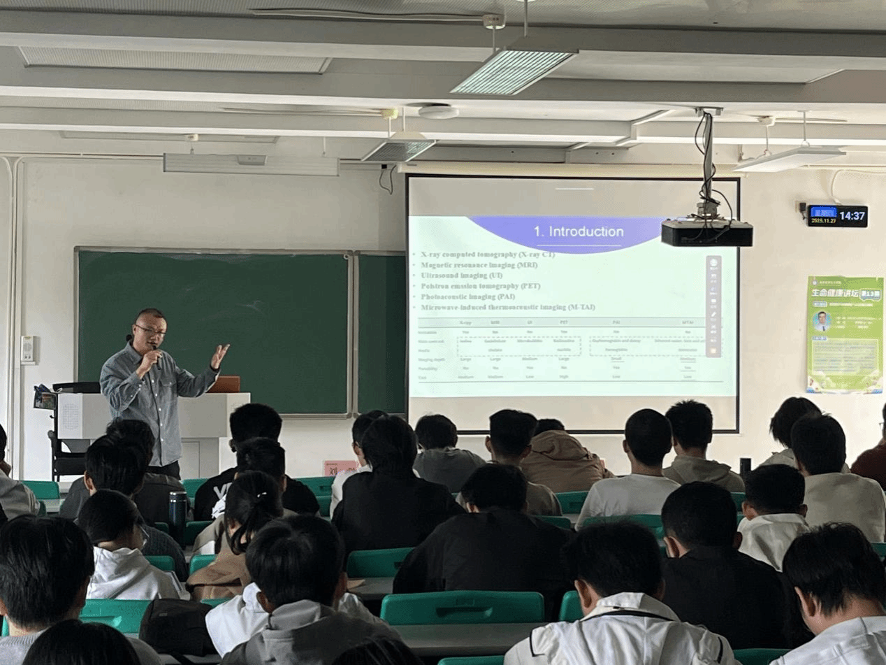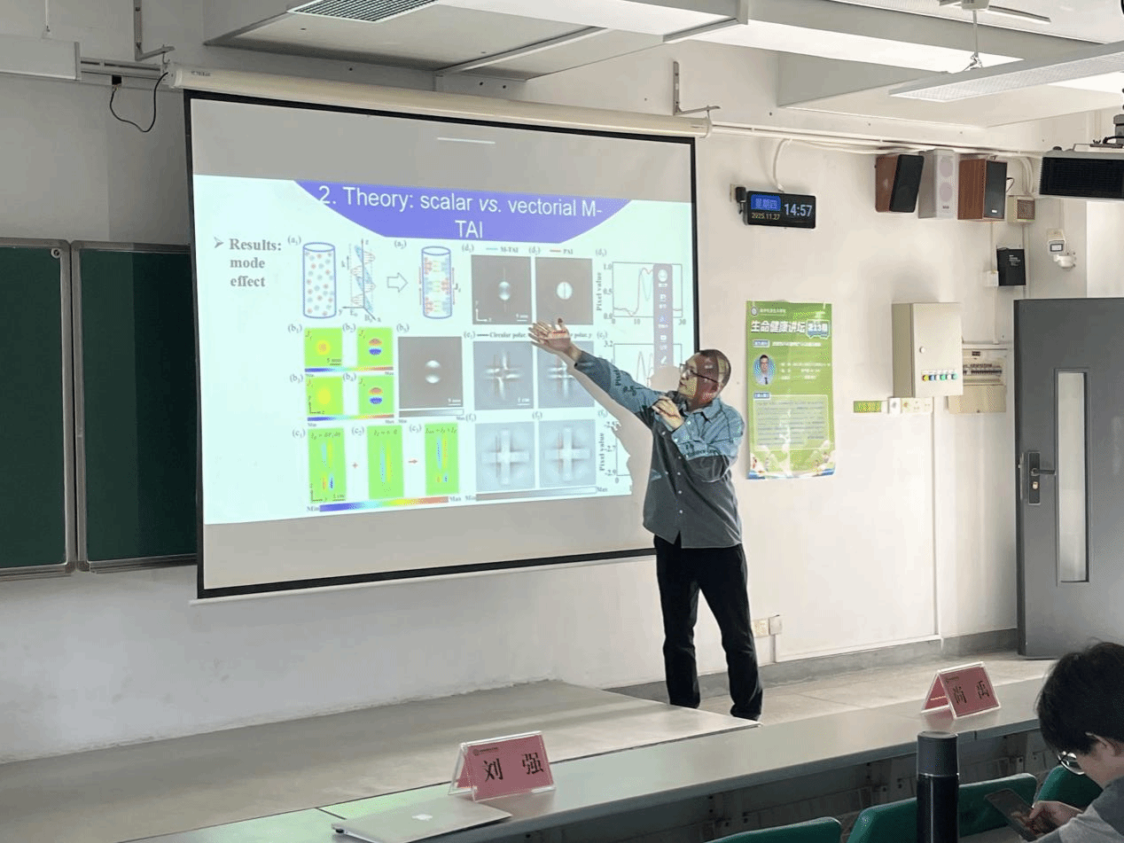 在学术报告环节,刘强老师作了题为《微波热声成像理论与方法研究进展》的专题讲座。刘强老师首先介绍了微波热声标量、矢量成像的共同起源问题,该工作是新型医学成像的理论基础。随后,刘强老师详细讲解了与微波辐射场矢量特性紧密相关的物理伪影及其抑制方法。最后,刘强老师针对微波热声成像灵敏度无法满足早期乳腺癌检测需求的问题,提出了一种基于电磁拓扑结构调控的新型方法,在体成像结果表明,其成像灵敏度较过往提高了3.3倍。上述工作有望为解决一系列生物医学影像领域的复杂问题提供新思路和新方法。刘强老师以生动的语言,结合自身工作经历进行讲解,给师生们留下了深刻印象。在提问环节,师生们与刘强老师积极互动,现场气氛热烈。