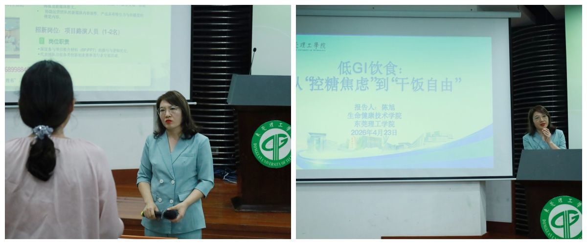 在专题报告环节,陈旭作了题为《低GI饮食:从“控糖焦虑”到“干饭自由”》的专题讲座。针对当前慢性疾病年轻化趋势明显,以及因不合理饮食导致的餐后困倦、体重波动、皮肤问题等大学生群体中普遍存在的现象,报告从淀粉结构、膳食纤维、脂肪、蛋白质、进餐顺序及食物加工方式等多个维度,系统阐述了影响食物GI值的关键因素。同时,针对大学生常见的饮食误区,讲座结合食堂、外卖、宿舍等实际场景,提供了具体的低GI饮食方案与实用烹饪技巧,引导同学们将科学饮食理念融入日常生活,实现从被动控制到主动健康的转变。在互动交流环节,与会师生围绕“快碳与慢碳在运动不同阶段的应用”、“少食多餐的实践方法”等问题,与陈旭进行了深入交流与探讨。